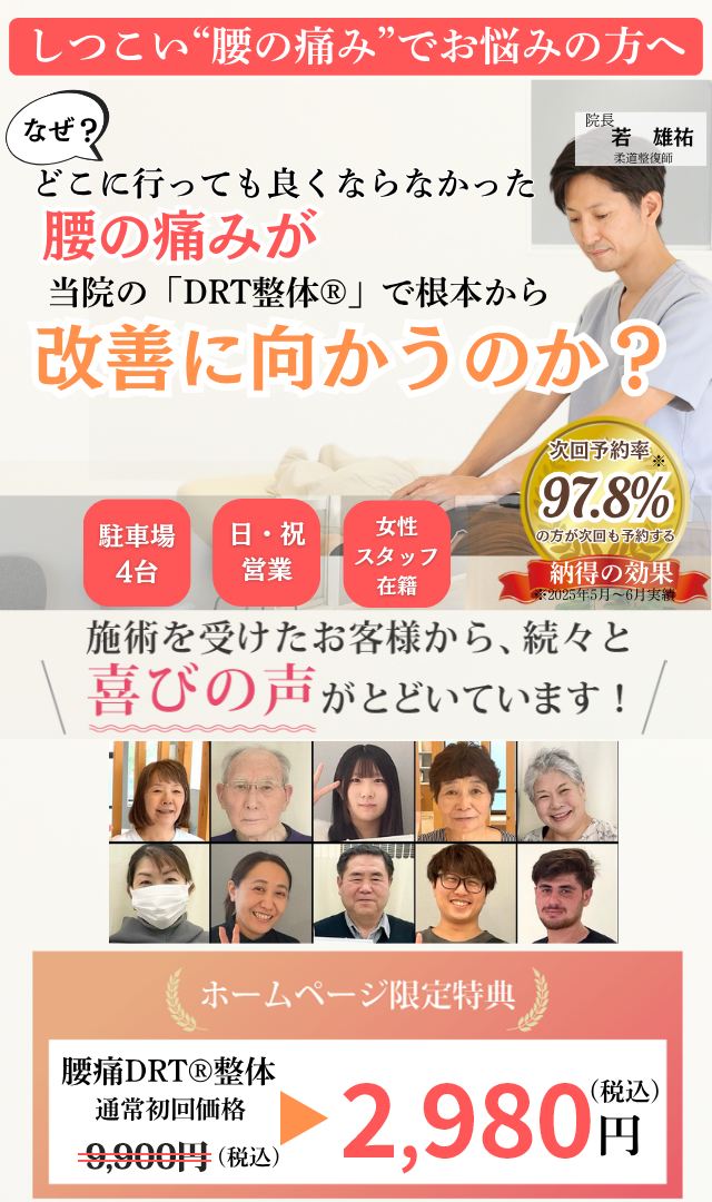 当院で行う整体DRTでは、この脊骨の歪みを調整することで、自然治癒力を引き出し、辛い腰痛を根本から改善します。