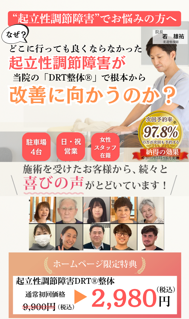 当院で行っているDRT整体®なら、起立性調節障害の根本原因である「背骨のズレ」「姿勢」「神経の働き」に同時にアプローチ。