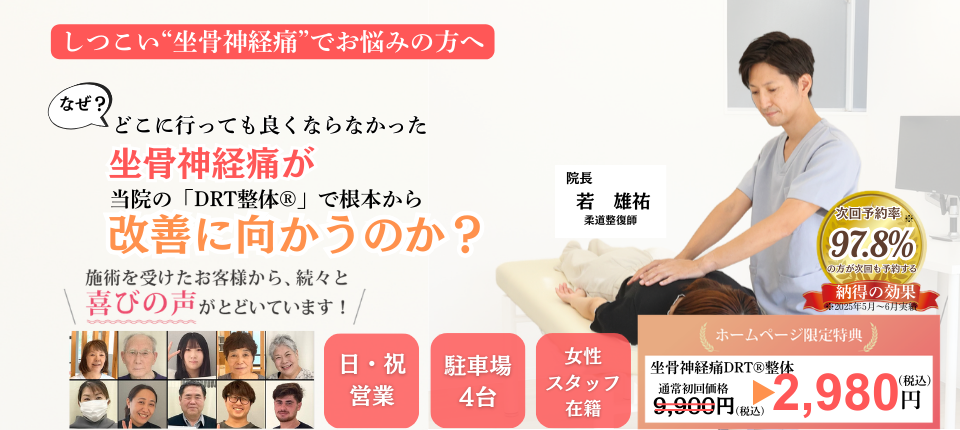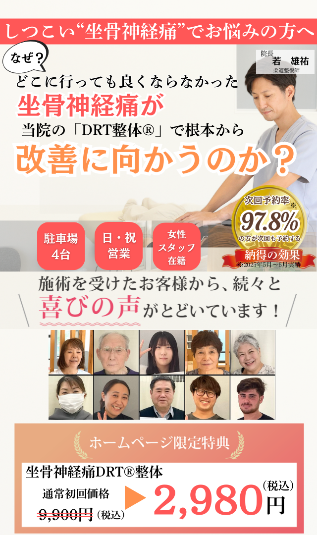 当院で行う整体DRTでは、この脊骨の歪みを調整することで、自然治癒力を引き出し、辛い坐骨神経痛を根本から改善します。