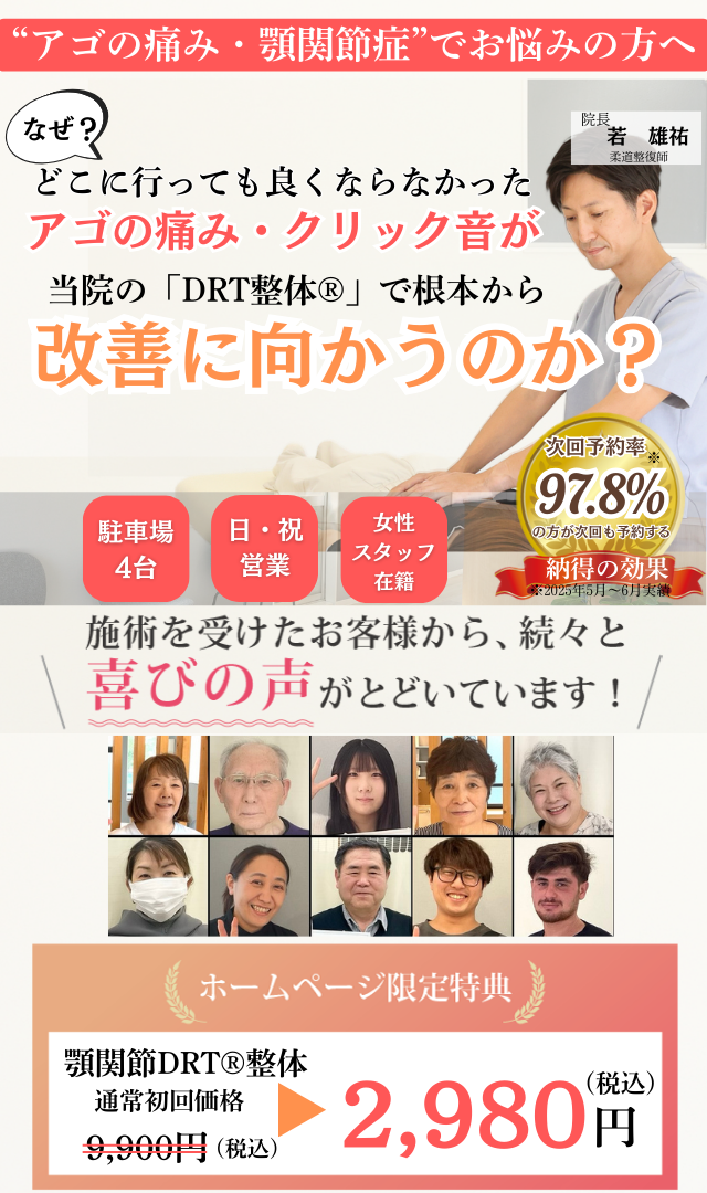 当院で行う整体DRTでは、この脊骨の歪みを調整することで、自然治癒力を引き出し、辛いアゴの痛み、顎関節症を根本から改善します。