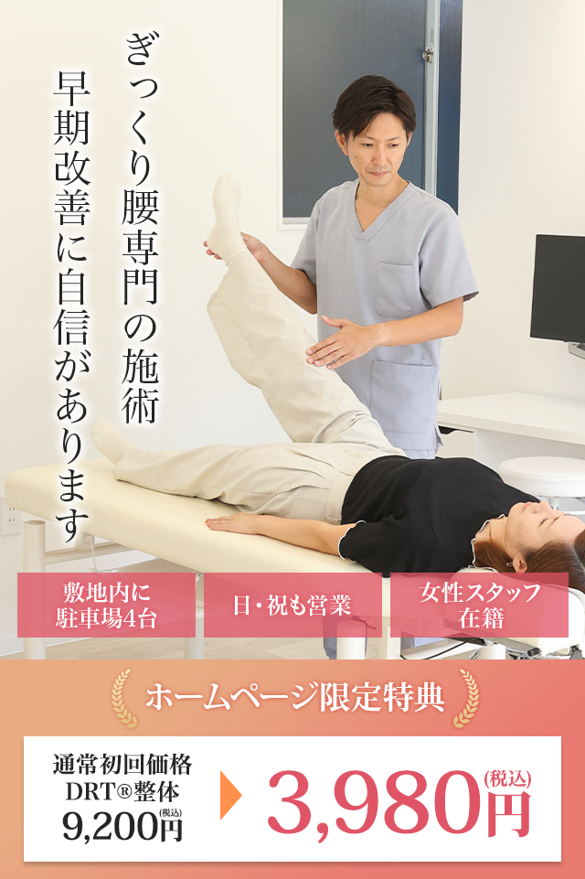 当院で行っているDRT整体®なら、ぎっくり腰の根本原因である「背骨のズレ」「姿勢」「神経の働き」に同時にアプローチ。