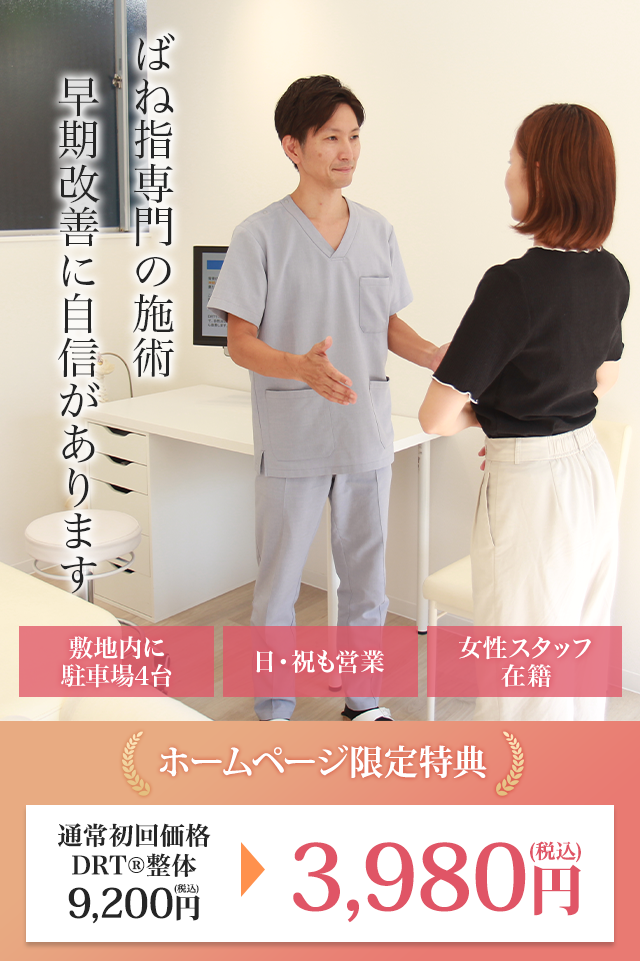 当院で行っているDRT整体®なら、ばね指の根本原因である「背骨のズレ」「姿勢」「神経の働き」に同時にアプローチ。